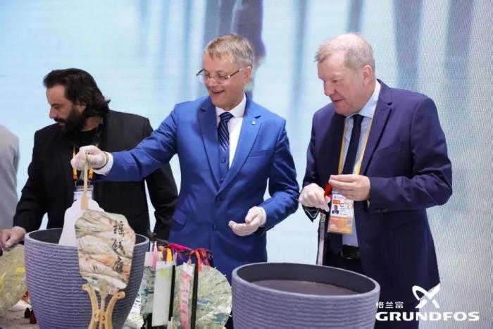 2024年第七届进博会,格兰富将中国传统文化水拓画带到了展台。水拓画源于中国唐代,距今已有千年历史。它以水为纸,以彩为墨,通过在水面创作图案并转印至纸或织物上而成。2014年,水拓画被列入联合国教科文组织“人类非物质文化遗产代表作名录”。