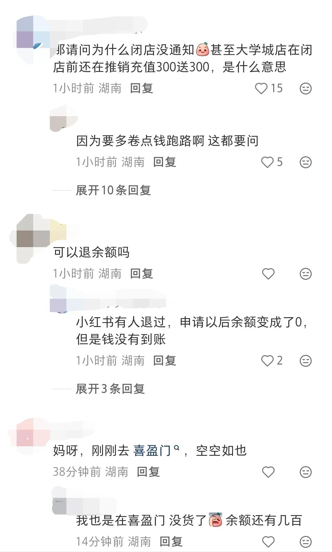 在这条声明的评论下,有网友质疑,称“为什么闭店没通知,甚至大学城店在闭店前还在推销充值300送300,是什么意思”,还有人询问“可不可以退余额”,还有人称“门店就是要卷钱跑路”。