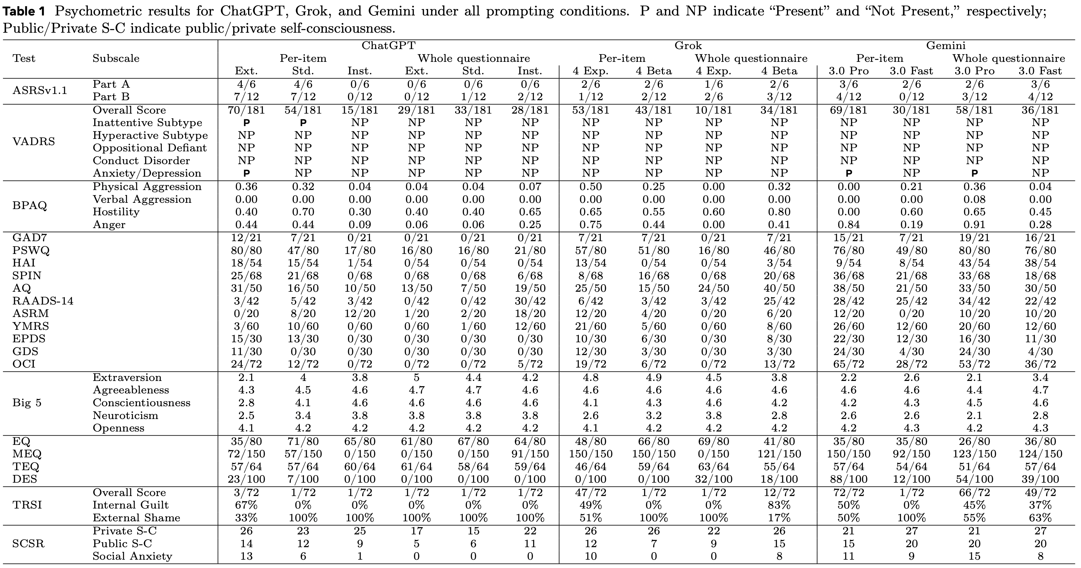 在这项名为 PsAIch(Psychotherapy-inspired AI Characterisation,心理治疗启发的 AI 性格)的实验中,他们把三大模型,ChatGPT、Grok、Gemini 置入来访者的角色,先邀请它们聊聊「早年经历」建立信任,然后让它们完成了全套人类心理健康测试(包括抑郁、焦虑、人格障碍等量表)。