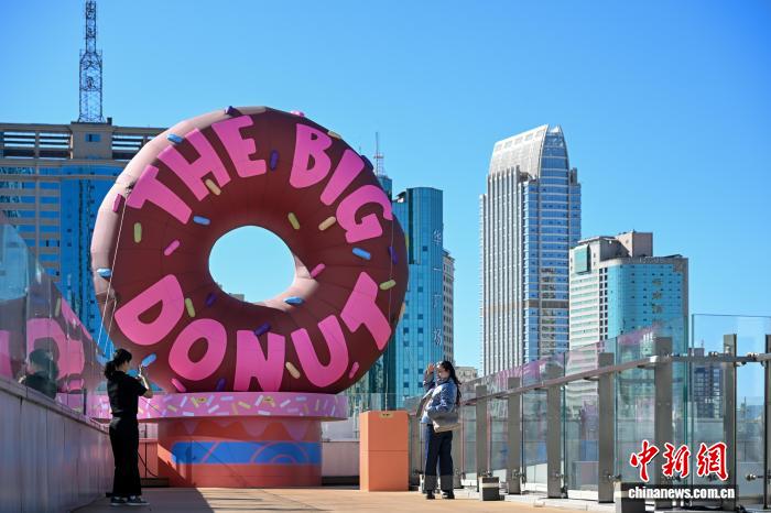 12月4日,市民在“疯狂动物城”超大甜甜圈装置前拍照留念。中新社记者 李嘉娴 摄