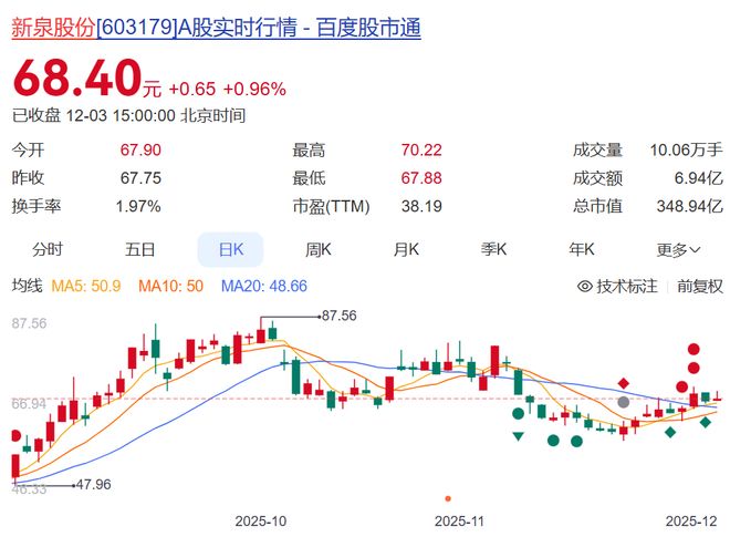 截至12月3日收盘,新泉股份股价报68.4元,年内涨超60%,总市值348.94亿元。